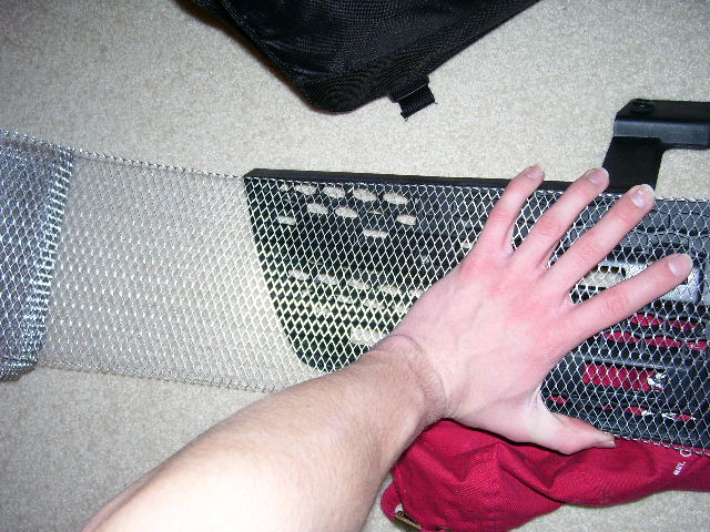 2. I also used the "gutter guard" but I got an approx. 3 ft X 8 in piece that is thicker than the roll shown above. So I couldn't wrap it around the grill backing. What I did was I spaced out 6 screws evenly 2 are hidden under the hood. Then trimmed the mesh around the grill backing.