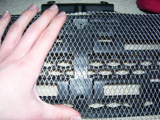 Flip the grille piece over and lay it out over a cut length of mesh. Then, holding everything straight and still with one hand, use your other hand to tightly fold one end of the mesh over the end of the grille piece. Cut small holes in the mesh for the original screw posts (do this well and tight, as this will hold the mesh on in the end).