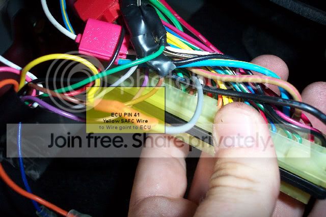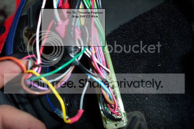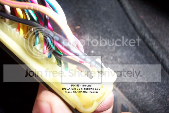 Step 1: Disconnect Battery Ground Cable Step 2: Disconnect ECU Harness from ECU by Unscrewing 1ea Screw from end without metal clip. Pull down with metal clip and angle out. Step 3: Clip Ziptie on Metal clip end, unwrap electrical tape and pull 4 inch plastic piece out. This loosens the harness from the plug. Now grab the plastic casing of the plug and the wiring harness and push towards each other, interior plug will pop out the bottom. Remove black plastic plug casing and you will have a lot more room to work with. Here is what the harness will look like. I have color coded the picture below to show you what ECU wires you will hook your SAFC2 wires to. https://img.photobucket.com/albums/v...ll/EcuPlug.jpg You can either use wire taps or solder. Solder is more difficult, but more secure and probably alot more stable. You have 5 ECU wires you will be connecting to and 7 SAFC2 wires you will be connecting. Green SAFC2 wire to PIN 47 - RPM Signal https://img.photobucket.com/albums/v...ll/Green47.jpg Gray SAFC2 wire to PIN 73 - Throttle Position Sensor https://img.photobucket.com/albums/v...all/Gray47.jpg Locate ECU PIN 41 and Cut the wire about 4 inches from ECU plug. Connect the Yellow SAFC wire to PIN 41 running into ECU plug. https://img.photobucket.com/albums/v...l/Yellow41.jpg Connect the White SAFC2 wire to other end of PIN 41 wire. Red SAFC2 wire to PIN 58 +12v Power Locate PIN 55 and splice the Brown SAFC2 Wire close to the ECU Plug Splice the Black SAFC2 Wire after the Brown SAFC2 Wire. Both Brown and Black need to be spliced to the wire running into PIN 55. <span style="color:red">Do not splice them into each other!</span> https://img.photobucket.com/albums/v...ackBrown55.jpg Purple SAFC wire to PIN 70 - Knock Sensor You can either assemble the plug casing back together or leave it off. I chose to leave mine off. Plug the ECU plug into the ECU and hook up the battery. |