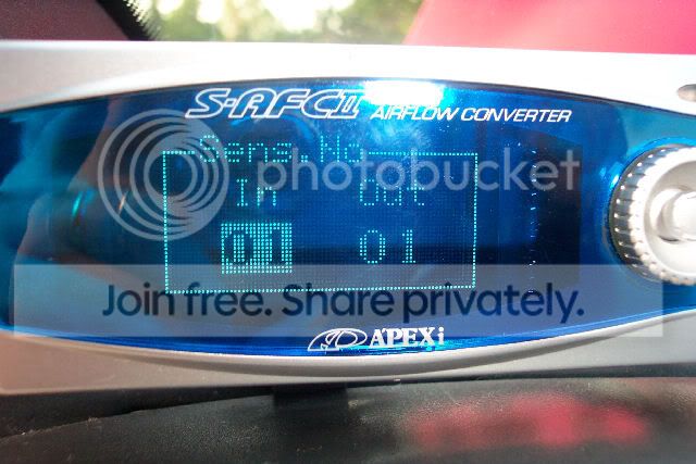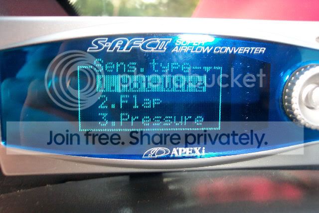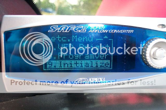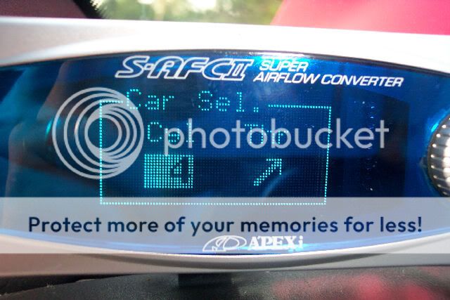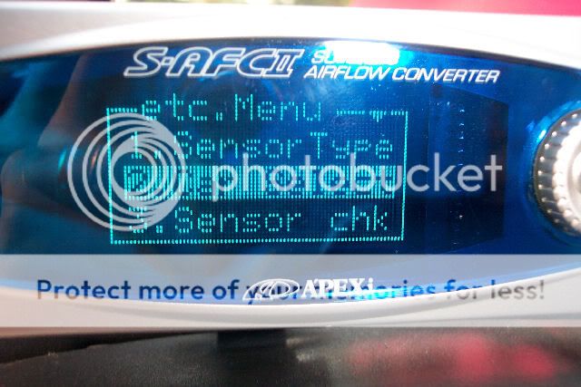 After the animation you should see this menu: https://img.photobucket.com/albums/v...l/MainMenu.jpg To make a selection you press in on the center button. Press right to go to next, press left to go to the previous, press up to go to the top level. I chose to initialize mine since I bought it second hand. The SAFC2 does not require constant power to maintain the settings. It stores them in memory. The good part about that is if your battery dies, or you unplug it you will not lose your settings. To initialize select ETC. from the menu, scroll all the way to the bottom and you will see the screen below. Push in on the button. https://img.photobucket.com/albums/v...Initialize.jpg Now go back to the ETC. Menu and Select Sensor Type: https://img.photobucket.com/albums/v...ll/etcMenu.jpg Select Hot Wire: https://img.photobucket.com/albums/v...ensorSetup.jpg Select Sens No 1 and 1: https://img.photobucket.com/albums/v...all/SensNo.jpg Select Sens Cal 1 and 1: https://img.photobucket.com/albums/v...ll/SensCal.jpg Go back to the ETC. Menu and Select Car Select. Set it to 4 and arrow up to the right: https://img.photobucket.com/albums/v.../CarSelect.jpg |