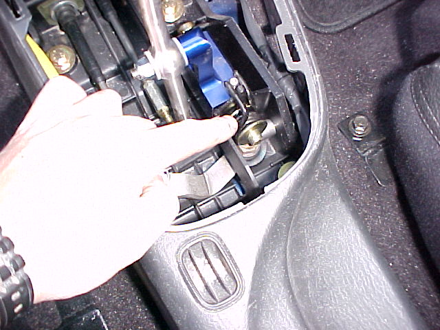 13) It’s now time to install the new shifter into your car. You need to make sure you line up the shaft sticking out of the bottom of the shifter with the hole in the shift linkage. If it doesn’t slide in easily, you may need to use a very small amount of grease in the hole.