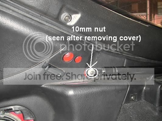 8. Pop off the little cap that's covering where the shock absorber mounts, and remove the nut(10mm).