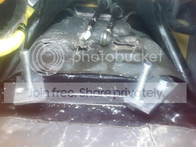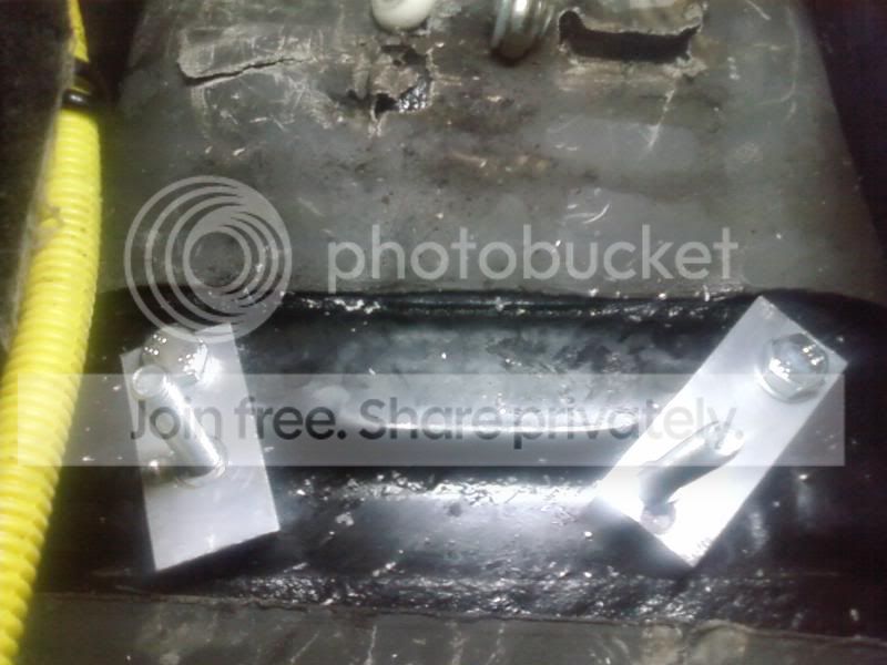 I headed over to home depot and got some bolts, nuts, washers, and a few feet of aluminum to work with. I cut a few small strips and drilled some holes in them, bolted them down, then installed the bracket. Looking through the front two holes, I aligned the metal strips, then marked them for drill holes. I took everything off again and drilled the holes and ran long bolts through them, getting this: