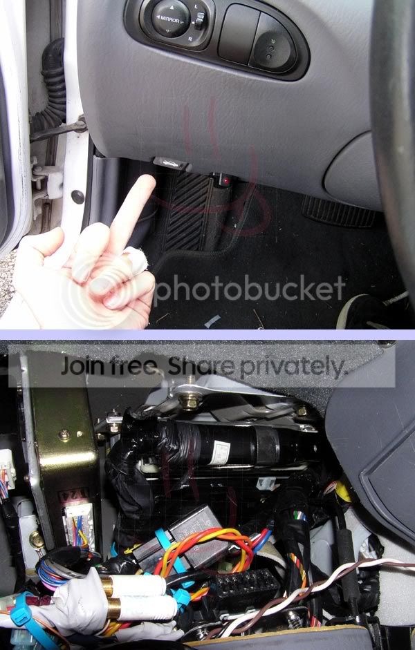 Dang it's crowded under my dash. The RCAs are for my garage door opener, the rest is for the alarm. That gold thing is the TCM, and if you know what the ECM connector looks like, you can tell where the ECM is relative to the TCM