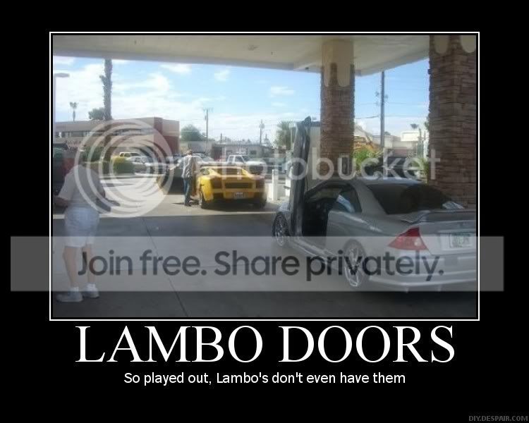 Plus, lambo doors are like altezzas now. EVERYONE freaking has them. Its gotten to the point where having normal opening doors is more unique than anything. *lol* I guess I'm not a good person though to talk about this modification to, since I'm biased and already hate the mod. But for those that want to go forward with it, more power to them and I wish them luck with it.