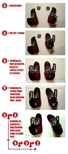 - [*]Do NOT twist your foot; pivot your leg at the knee, and press down from the knee. Bring your knee inwards, so that it places your calf and foot at an angle that makes it look like you're knock-knee'd. Blip by moving your thigh downwards, while retaining a stabbing motion with your heel[this will being the outer edge of your right foot down much more quickly than trying to blip with just your foot.] [*]You do NOT have to have the ball of your foot on the brake and the heel of your foot on the accelerator[no matter how much Initial D you've watched, we're real people with real muscles and skeletons. AND, the previous method is faster to pull off with less discomfort.][*]If you wish, you can also roll your foot sideways if it suits you better[this is however done more often with cars that have very small leg-room and with very close-in pedal boxes, ie. Formula Fords and other open-wheelers][*]Have the correct footwear; slim shoes such as boxing boots, thin-soled X-trainers or anything else with a slim sole that lets you feel the pedal. DO NOT try this with thongs and slippers. After a while, you'll be able to do it natrually. After that time, you should be able to do it even when wearing a pair of CLOGS.
