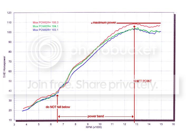 That should explain everything. Now, basically there is a dropoff behind peak power(this is the graph off of an R6 BTW, not off of a car. Its pretty textbook and its all we need for this demo.) There isn't a reason to go past the shift point(here at approx 12,800rpm) because you are not making any more power(you will be stressing your engine needlessly and actually losing your forward motion) Thus, shift at peak power or just after it(to compensate for rev dropoff at the time the throttle is lifted)