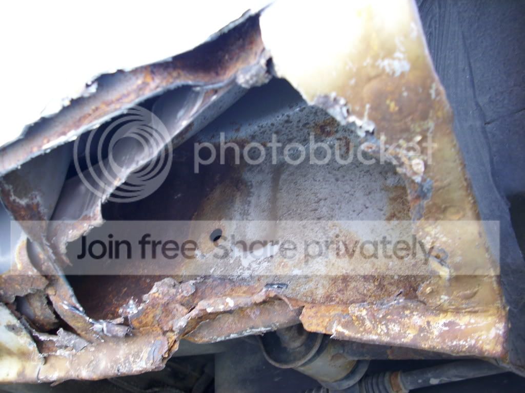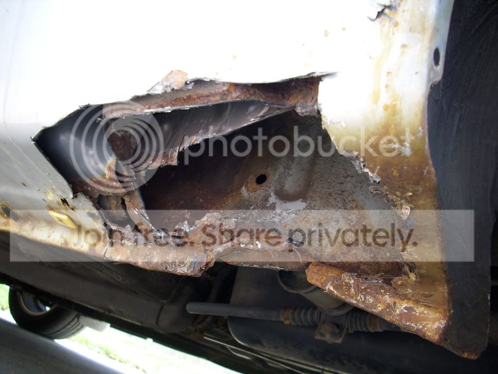These pictures are whats left after taking everything that was flaky or was thin. For size refrence, you can see whats left of the jack mount. i would say its a good 4x6 hole...ALL neatly hidden behind the sideskirts.