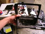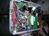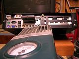 the back of the case was hacked up a lot. i am running a lot of wires into this case, and am utilizing just about everything the motherboard has to offer. the power plug on the right is the stock power supply jack for power and ground. since im not using that i will be using that jack to run power to my lilliput touchscreen. the 6 pin molex connector is for my powersupply. there is a smc coax terminal for my gps cable. i cut apart a case front panel thingy with firewire, 2usb, and audio. the two audio are on the back of the case in the middle(i will need the additional line in for my xm radio because i am using the motherboards smart5.1, which converts all the MB audio jacks to outputs). the rest are going to be in a cool little spot which you will see below. thats what the 2 cat5 jacks on the back are for. i have already extended all the cables and made all the crimp connections, which is easily the most time consuming.