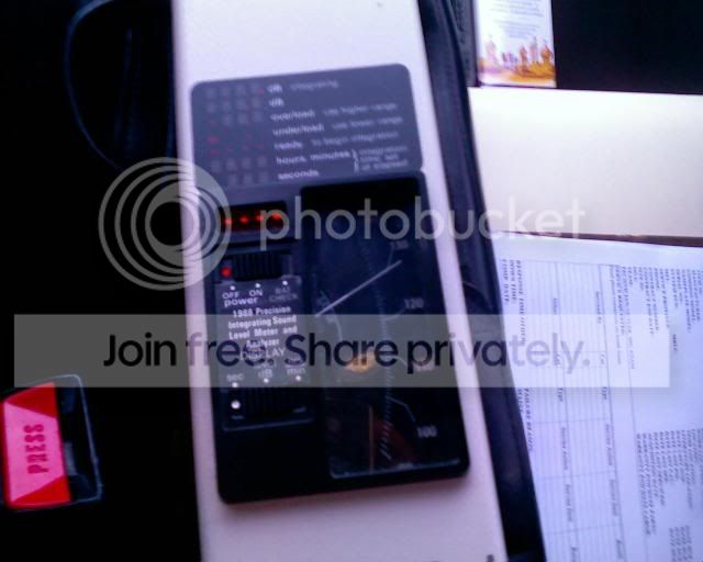 I had a chance to work on an audiometer booth not too long ago. I had a dB meter in my car. My car reached 129dB when monitoring @ 32Hz center frequency range.. This is a calibrated instrument traceable to the national institute of standards and technology, meaning 1dB = 1 dB. I just thought this was cool and had to take a pic and post it here. Anyone know what freq they monitor at a standard dB drag?