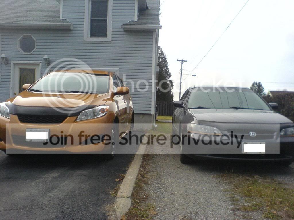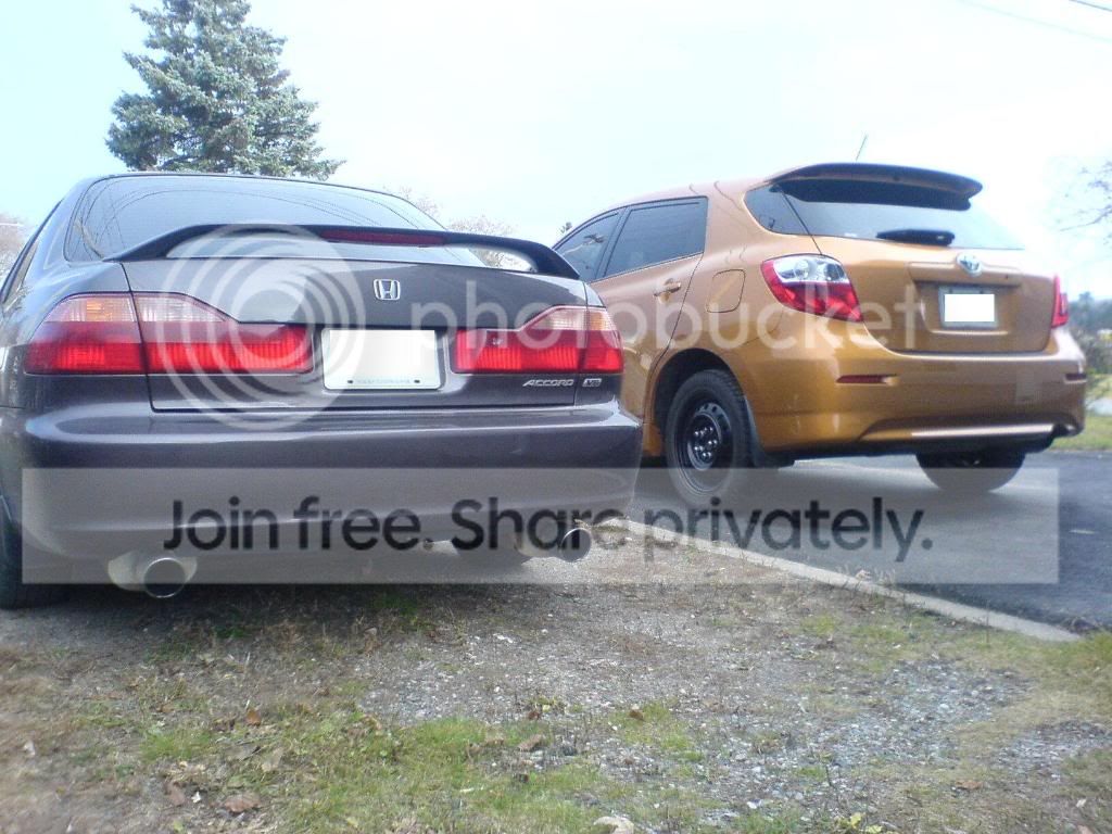 My old Accord (mods visible in pics are Magnaflow cat-back, 1.5 Eibach lowering springs, and DIY blackhoused headlights), and my current Matrix (mods visible in pics are de-badged hatch, rear limo tint and 15% front, and pending mod: Tein lowering springs)