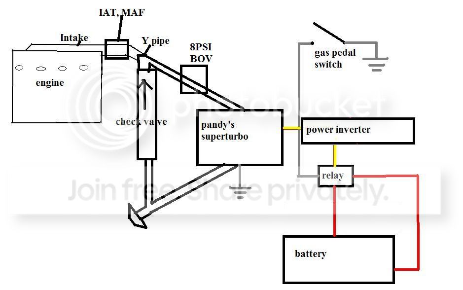 oh yeah, the point of the check vavle would be to reduce the resistance from the super-turbo. The blades of a turbo are ment to be spinning all the time when the car is in operation. Just to be safe i drew that in. I don't know if it's needed or not. It will allow the air to be free flowing when the superturbo is off, then when it starts to boost, the air will be trapped in the intake manifold.