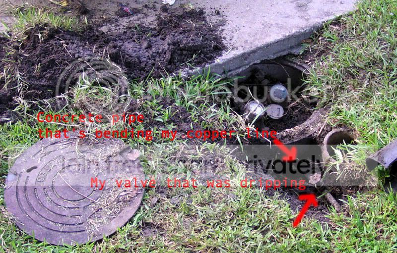 The copper line running from the meter: being impinged upon by the concrete meter pipe, but not broken yet