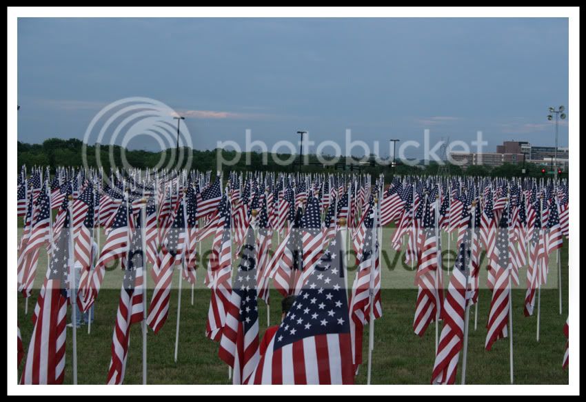 There was an area set up in my town where 1500 American flags were placed in the ground. They were holding remembrance services for fallen soldiers and signing banners to send to Afghanistan to show support for our soldiers. Here are some pictures I took, it's really amazing to see 1500 flags.