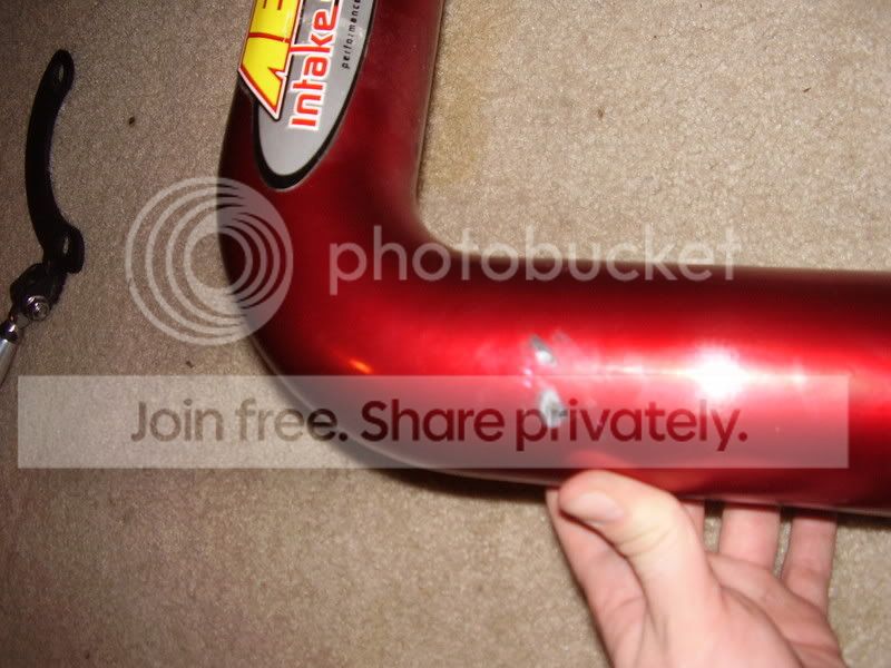 AEM CAI: some scuffs and minor damage. pics show the damage (also i just noticed that the rubber spacer and bolt that go on the bracket that sticks off the bottom are gone. I assume they are still on the car but im not sure. You should be able to pick something like this up at a hardware store.