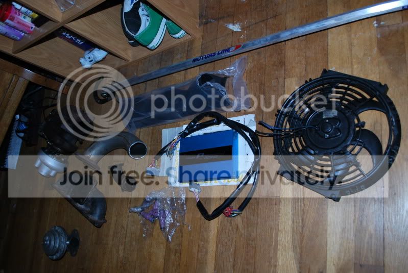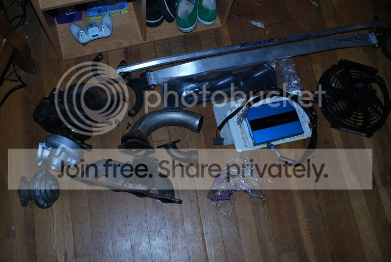Time to sell the kit that I purchased from Fintile awhile back. I haven't had time to install the kit, and working two full time jobs, possibly relocating and starting school soon, I need the car to run reliably right now over the extra power, so Im going to sell the kit. Included is a slim fan, gReddy emanagement system, downpipe, wastegate, manifold, td05 turbo, bigger fuel injectors, 52mm triple gauge pod. Im asking 450$ plus shipping for it anywhere in the US.