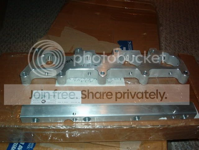 This is a special plate that Denisst99 modified slightly for me. You will notice the hole i am pointing too in one of the pics. This is a hole drilled and tapped to take a NOS nitrous direct port fogger nozzle. There are 5 holes 4 is the same place and a 5th on the end incase there are clearance issues with steering pump or A/C pump. This is the full deluxe kit that Dennisst sells with all you need. It also comes with plugs to put in the nitrous nozzle holes incase you don't want to use the nitrous holes. Paid 510 Cdn never installed, Let it go for $260.00