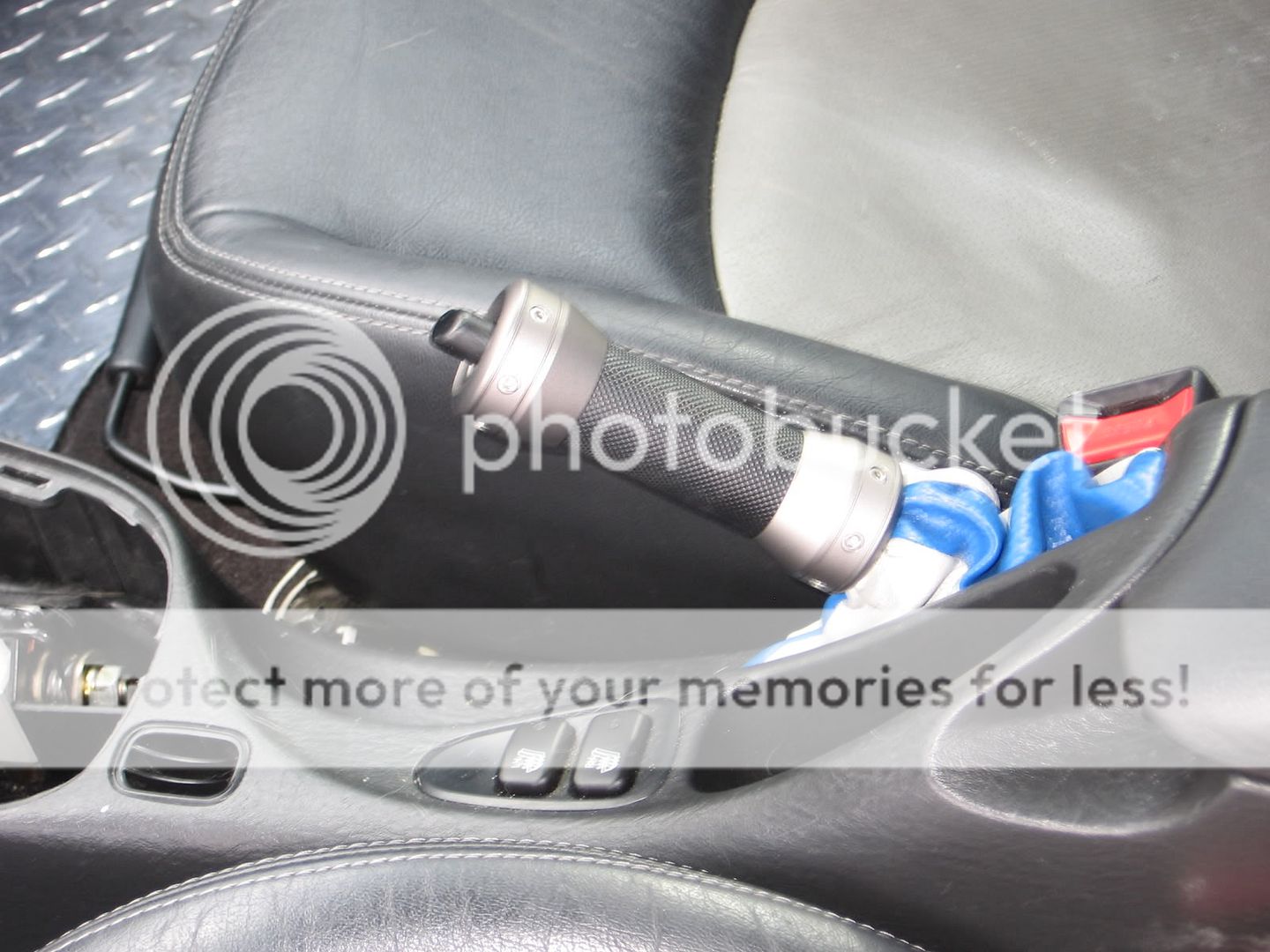 Pretty easy to do, get a GK Tiburon ebrake cover (Rubber), and trim it off at the first 3rd ring back from the front. Get a sharp knife and grind out the rubber stopper blocks on the inside. Get a set of Tuscani Ebrake Rings from Kspec or elsewhere, and mount them. Smack it on with your palm or a rubber mallet. Done. I'm swapping out the rings shortly with the silver set to match the knob.
