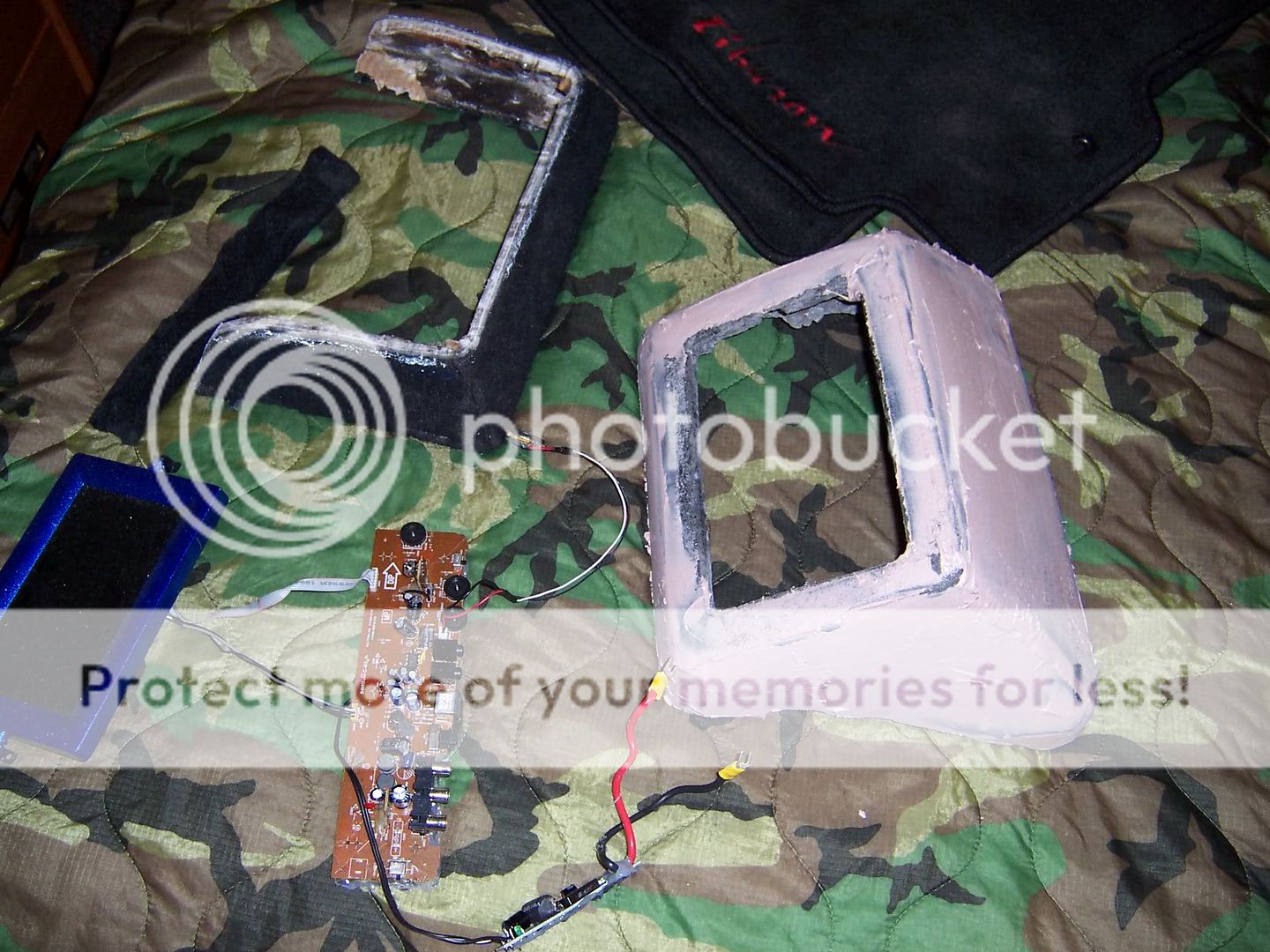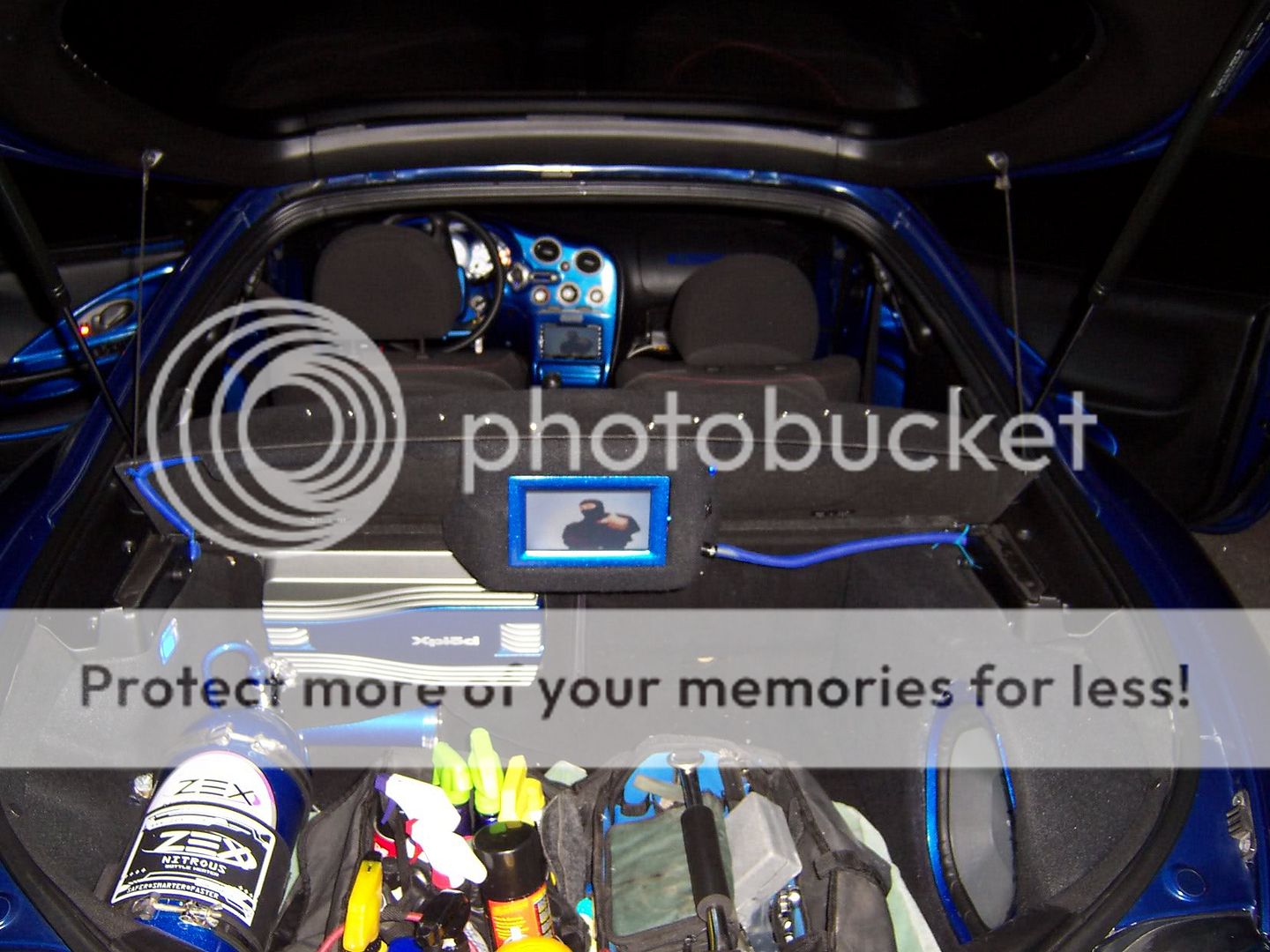 the screen positioning looks good, but, I'd consider doing something to hide the wires. Wire loom isn't good.. maybe put a flat black panel covered in carpet on the bottom of the trunk cover. That will hide the wires and make the TV look more flush rather than sticking out. Use black wire loom if you need to use it at all, especially in the trunk. Leave the blue for the accessories (bottle and amp). I'd even consider making the screen outline black instead of blue, but I'd have to see it in person. ....and cut the excess on the zip ties, you don't want any ties showing. Edit: If you can cut into the wall next to the sub, mount the cap in there with it sticking halfway in, half out... so it's angled and floating inside the wall. |