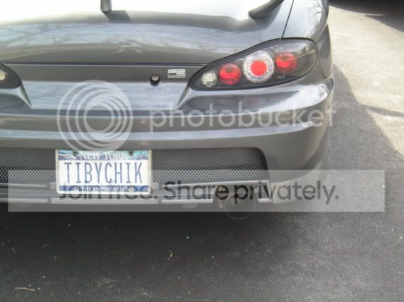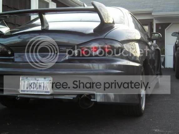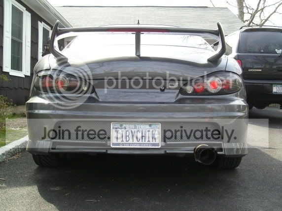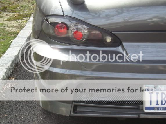 Ok so this is the first time Im really posting about this. Back in Novemeber, about 2 days after I got my car painted, I backed out of my driveway and into a flatbed tractor trailer. Its a long story but basically he wasnt supposed to be parked there, and I couldnt see the flatbed part because it was so low, and there was a Mexican driving a bobcat with a bunch of rebarb in my way. So pretty much I backed up too far and hit the thing. It cracked a hole in my tailight and made a nice gash in my fiberglass bumper. If you look closely to the left in the picture you can see like a white line. Thats the only pic I could find of it.